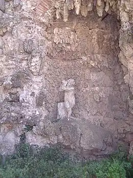 La façade arrière donne sur les vestiges d'un jardin à l'italienne qui comportait à l'origine des grottes et des stalactites, sur le côté un bosquet de chênes et lauriers est délimité par une série de bâtiments annexes parmi lesquels l'ancienne église Madonna della Neve datant du XVIe et rénovée au XVIIe siècle, ainsi que des anciens murs des fortifications, du projet architectural du nymphée à niches avec quatorze statues en terre cuite représentant les Vertus, de style renaissance tardif, datant des années 1630. L'ensemble est complété par la « Palazzina Vitelli ».