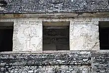 La façade du Temple de la Croix s'est en grande partie effondrée, révélant l'intérieur de l'édifice. Il est associé à GI. La Tablette de la Croix au centre du sanctuaire est une réplique. L'original se trouve aujourd'hui exposée au Musée national d'anthropologie de Mexico. Encadrée par les figures de K'inich Kan Bahlam, jeune et vieux, l'icône centrale représente l'arbre de la création qui se trouve au centre du monde (axis mundi) selon la mythologie maya[22]. L'arbre émerge d'un masque du monstre terrestre. À son sommet se trouve perché un oiseau surnaturel. Les personnages se tiennent sur une bande céleste[23]. Tout le programme iconographique du Temple de la Croix fait référence à la sphère céleste et aux ancêtres.