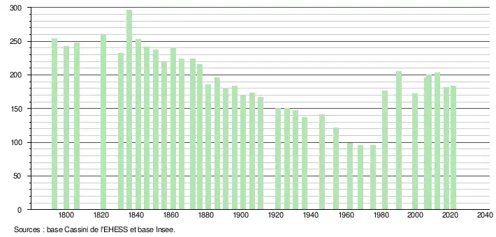 L'évolution du nombre d'habitants est connue à travers les recensements de la population effectués dans la commune depuis 1793. Pour les communes de moins de 10 000 habitants, une enquête de recensement portant sur toute la population est réalisée tous les cinq ans, les populations légales des années intermédiaires étant quant à elles estimées par interpolation ou extrapolation[25]. Pour la commune, le premier recensement exhaustif entrant dans le cadre du nouveau dispositif a été réalisé en 2007[26].