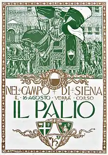 Pour finir, le cortège historique se conclut par le Carrocio (réplique d'un char de guerre du Moyen Âge que les communes déplaçaient, avec le drapeau et l'autel, pour se réunir en prières avant le combat). Le char du XVI, où siègent les représentants du Conseil des Neuf, porte le Pallium, le Palio, tenture en soie peinte réalisée par de célèbres artistes siennois ou par des représentants contemporains, comme Guttuso, Cagli ou Mino Maccari. Sur le char, six petites trompettes de la commune jouent la marche du Palio. Le char est escorté ensuite par les chevaliers des Contrade qui ne participent pas à la course et de celles qui n'existent plus.