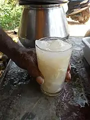 - Cette sève, qui contient de l'ordre de 15 % de sucre, peut être consommée fraîche, comme une boisson nourrissante car outre des sucres (en majorité du fructose), elle apporte des protéines et des sels minéraux et oligo-éléments. Le sirop de palmier peut être vendu frais sur les marchés. Mis à fermenter, il permet de produire du vin de palme (ou toddy hindi : ताड़ी), et par distillation de ce dernier de l'alcool.