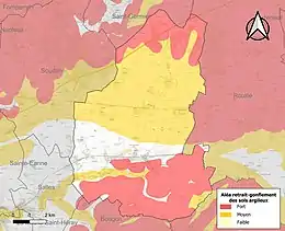 Les mouvements de terrains susceptibles de se produire sur la commune sont des tassements différentiels[17]. Le retrait-gonflement des sols argileux est susceptible d'engendrer des dommages importants aux bâtiments en cas d’alternance de périodes de sécheresse et de pluie[18]. 83,3 % de la superficie communale est en aléa moyen ou fort (54,9 % au niveau départemental et 48,5 % au niveau national)[Carte 2]. Depuis le , en application de la loi ELAN, différentes contraintes s'imposent aux vendeurs, maîtres d'ouvrages ou constructeurs de biens situés dans une zone classée en aléa moyen ou fort[Note 2],[19].