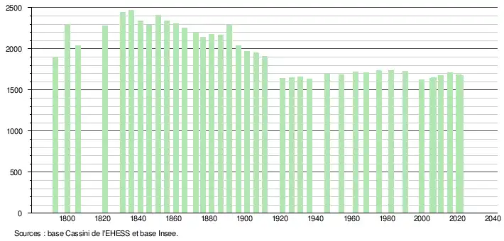 L'évolution du nombre d'habitants est connue à travers les recensements de la population effectués dans la commune depuis 1793. Pour les communes de moins de 10 000 habitants, une enquête de recensement portant sur toute la population est réalisée tous les cinq ans, les populations légales des années intermédiaires étant quant à elles estimées par interpolation ou extrapolation[23]. Pour la commune, le premier recensement exhaustif entrant dans le cadre du nouveau dispositif a été réalisé en 2005[24].