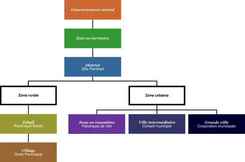 - Panchayat samiti (en) : (panchayat intermédiaire correspondant à un tehsil) (les États dont la population est inférieure à 2 millions d'habitants ne sont pas tenus de créer des panchayats intermédiaires) ;