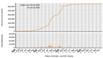 - En 2023 il y avait 2 219 nouveaux cas et 6 décès, portant le nombre de cas à 330 409 dont 2 800 décès[22].