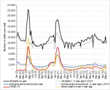 Le , le Royaume-Uni est le premier et seul pays européen à dépasser le seuil des 40 000 décès dus au Covid-19 à l’issue de la première vague et le deuxième pays au monde, après les États-Unis[13]. Le nombre de morts dépasse les 75 000 le selon la presse, alors que le gouvernement n'en reconnait que 60 000[14]. Plus de 100 000 morts sont recensés fin [15]. Près d'un an plus tard, en janvier 2022, plus de 150 000 morts ont été enregistrés[16].