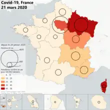 Le , l'ensemble des régions métropolitaines françaises et la Guyane sont touchées[34]. De nouveaux clusters apparaissent autour de Méry-sur-Oise (6 mars) et Ajaccio (8 mars)[35]. Le à Paris, Emmanuel Macron déclare qu'« il n'y a aucune raison, mis à part pour les populations fragilisées, de modifier nos habitudes de sortie[36] ».