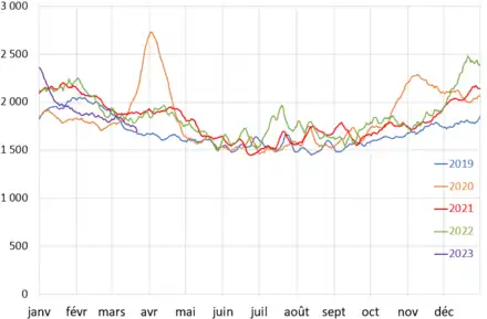 En France, elle est associée à une surmortalité journalière de 33 % entre le et le , comparativement aux valeurs moyennes des années 2000 à 2019 : « 2 120 décès ont été recensés en moyenne chaque jour par l'état civil, contre 1 590 en moyenne entre 2000 et 2019[6] ». Cette épidémie est plus meurtrière que les épidémies de grippe saisonnière du XXIe siècle en France[7]. Depuis la grippe espagnole de 1918, jamais une épidémie n'avait fait autant de décès en France.