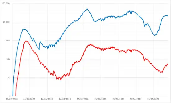 Le 31 juillet, Santé publique France fait état d'une circulation virale qui s'intensifie, notamment chez les jeunes où la moitié des sujets testés virologiquement positifs sont asymptomatiques. 19 départements sont en situation de vulnérabilité. Le R effectif est supérieur à 1 dans dix régions dont trois significativement par concordance des indicateurs relatifs aux résultats virologiques et aux passages aux urgences, il s'agit de Auvergne-Rhône-Alpes, Île-de-France et Grand-Est[77]. Le gouvernement vient d'autoriser les préfets à prendre des mesures restrictives ciblées si nécessaire, notamment concernant le port du masque dans les espaces publics[78],[79].