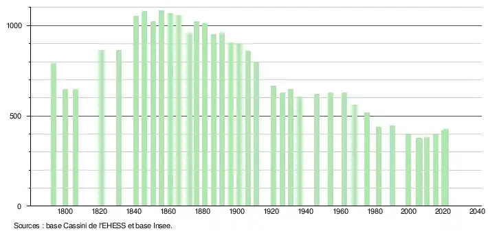 L'évolution du nombre d'habitants est connue à travers les recensements de la population effectués dans la commune depuis 1793. Pour les communes de moins de 10 000 habitants, une enquête de recensement portant sur toute la population est réalisée tous les cinq ans, les populations légales des années intermédiaires étant quant à elles estimées par interpolation ou extrapolation[27]. Pour la commune, le premier recensement exhaustif entrant dans le cadre du nouveau dispositif a été réalisé en 2005[28].