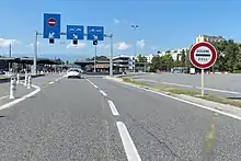 Le panneau de signalisation routière français circulaire à fond blanc, bordé d’une couronne rouge et portant en son centre une barre horizontale noire et les deux inscriptions "DOUANE" ainsi que sa traduction dans la langue ou l'une des langues du pays limitrophe indique la proximité d'un poste de douane où l'arrêt est obligatoire. Ce signal est codé B4[1],[2].