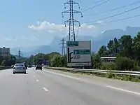 | D52a | Bifurcation autoroutière simple | Bleu | Représentation de l'embranchement de manière simplifiée. Chacune des deux branches autoroutières, terminée en pointe de flèche, est complétée par le numéro de l'autoroute concernée dans un encart rouge et par la ou les mentions caractérisant la direction. Un ou plusieurs encarts verts comportant un numéro d'itinéraire européen peuvent compléter, le cas échéant, le numéro des autoroutes. | Distance de la bifurcation. | ![]() |