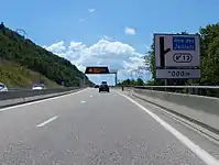 | Da51b | Sortie avec affectation de voies | Blanc | Schéma simplifié de l'embranchement. La voie de sortie affectée est représentée par un trait séparé terminé en pointe de flèche et complété par le symbole d'échangeur SE2b ou SE2c | Distance de la sortie. | ![]() |