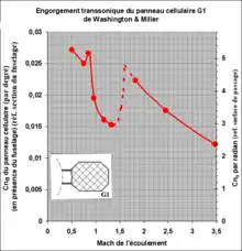 De nombreux auteurs ont relevé une brusque augmentation de la traînée axiale, accompagnée d’une brusque diminution de la portance, un peu au-dessus de Mach 0,7[26] (plus précisément aux alentours de Mach 0,77). À cette vitesse, la réduction de la section de passage due à l’épaisseur des cloisons des cellules, ainsi qu’à l’épaisseur de la couche limite qui s’est développée sur ces cloisons oblige le flux à une accélération (par effet Venturi), cette accélération élevant localement la vitesse jusqu’à celle du son. Il en résulte la création d’une onde de choc normale détachée à l’avant des panneaux qui détourne l’écoulement vers la périphérie de ce panneaux (ce qui augmente la traînée). Au-dessus de Mach 1, les bords d’attaque des cloisons de cellules forment chacun une onde de choc interne orientée vers l’arrière, ces ondes internes se réfléchissant sur les parois internes des cellules. Cette configuration résulte toujours en une obstruction des cellules. Puis, autour de Mach 1,5, l’angle des ondes de chocs se faisant plus aigu, il n’y a plus de réflexion sur les parois et la traînée reprend une valeur plus faible.