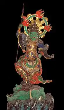 Les rois de la sagesse (Vidyârâjas) étaient à l'origine des divinités du bouddhisme ésotérique, mais ont ensuite été adoptés par le bouddhisme japonais dans son ensemble. Ces dieux sont dotés d'une connaissance et d'un pouvoir supérieurs qui leur confèrent une influence sur la réalité interne et externe. Ces rois sont devenus l'objet d'une personnification, soit pacifique dans le cas de personnifications féminines, et courroucé dans le cas de personnifications masculines. Leur agressivité exprime leur volonté de se débarrasser des forces négatives chez les fidèles et dans le monde. Ils sont donc une expression de la compassion du Bouddha pour tous les êtres[8].