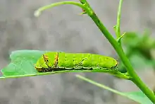 La chenille d'abord brune et blanche durant les premiers stades, mimant une fiente d'oiseau, elle devient ensuite globalement verte.