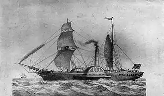 En 1807, l'ingénieur Robert Fulton réussit à appliquer le principe de la machine à vapeur aux navires. Il construit la première embarcation mue par cette technologie, le Clermont, qui parvient à rallier New York à Albany en une trentaine d'heures, avant d'entamer un service régulier entre ces deux villes[9]. D'autres vaisseaux reprennent rapidement cette innovation. En 1816, l'Elise est le premier navire à vapeur à traverser la Manche[10]. 1819 voit un nouveau progrès important. Le Savannah devient le premier navire à vapeur à traverser l'Atlantique. Parti de la ville du même nom, il rallie Liverpool en 27 jours. Toutefois, la traversée s'effectue principalement à la voile alors que la vapeur ne sera pas utilisée plus de 72 heures au cours du voyage[11]. L'engouement du public pour cette nouvelle technologie se réduit et, des 32 passagers qui avaient réservé une place à bord, aucun n'embarque sur le Savannah[12]. À cette époque, la navigation à vapeur ne convainc toujours pas les professionnels qui ne voient en elle qu'une curiosité, au point qu'en 1820, le propriétaire du Savannah débarrasse son navire de sa machine à vapeur[11].