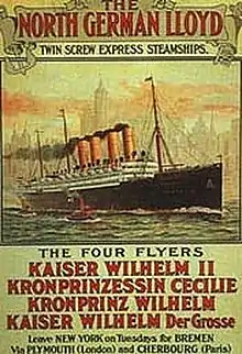 En 1897, l'Allemagne lance le Kaiser Wilhelm der Grosse de la Norddeutscher Lloyd suivi quelques années après par trois sister-ships. Ce navire long-courrier présente de nombreuses innovations : il est très luxueux et rapide et parvient à dérober le Ruban bleu aux Britanniques[27]. Il est également le premier des quatorze paquebots à quatre cheminées qui voient le jour dans l'histoire de la marine. Le navire n'en aurait eu besoin que de deux, mais un plus grand nombre de cheminées donne aux passagers une impression de sécurité et de puissance sur laquelle les constructeurs jouent[28].
