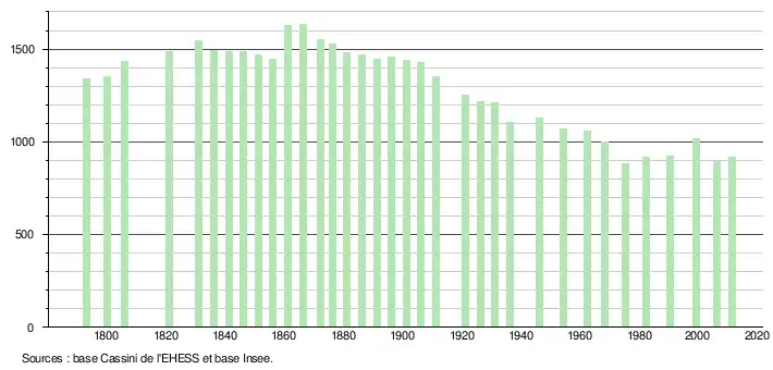 L'évolution du nombre d'habitants est connue à travers les recensements de la population effectués dans la commune depuis 1793. À partir du , les populations légales des communes sont publiées annuellement dans le cadre d'un recensement qui repose désormais sur une collecte d'information annuelle, concernant successivement tous les territoires communaux au cours d'une période de cinq ans. Pour les communes de moins de 10 000 habitants, une enquête de recensement portant sur toute la population est réalisée tous les cinq ans, les populations légales des années intermédiaires étant quant à elles estimées par interpolation ou extrapolation[25]. Pour la commune, le premier recensement exhaustif entrant dans le cadre du nouveau dispositif a été réalisé en 2006[26],[Note 1].