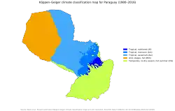 Le Paraguay est, du fait de ses coordonnées géographiques, un pays possédant un climat subtropical humide. Cela favorise deux phénomènes qui se produisent régulièrement, à savoir les cyclones (ou ouragans) et le phénomène El Niño qui atteint généralement son apogée vers la période de Noël, d'où son nom qui fait référence à l'enfant Jésus[14]. Le pays fait partie de ce que les chercheurs appellent « l'Amérique tropicale »[15]. Situé entre le 19e et le 27e parallèle sud et le 54e et 62e méridien ouest, il est traversé par le tropique du Capricorne[16]. On distingue généralement deux saisons[16] :