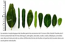 Les feuilles sont simples et très variables, les marges courbées vers le bas, oblongues étroites. Limbe (1 à 1,5 cm de large, 5 à 12 cm de long) épais à face supérieure vert foncé, face inférieure pâle. Pétioles courts, 8 à 10 paires de sous-nervures.