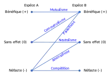 Ce tableau résume les possibilités d'interactions, en termes d'effets, entre une espèce A et une espèce B.