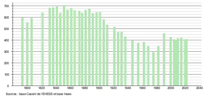L'évolution du nombre d'habitants est connue à travers les recensements de la population effectués dans la commune depuis 1793. Pour les communes de moins de 10 000 habitants, une enquête de recensement portant sur toute la population est réalisée tous les cinq ans, les populations légales des années intermédiaires étant quant à elles estimées par interpolation ou extrapolation[20]. Pour la commune, le premier recensement exhaustif entrant dans le cadre du nouveau dispositif a été réalisé en 2004[21].
