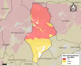 La commune est vulnérable au risque de mouvements de terrains constitué principalement du retrait-gonflement des sols argileux[15]. Cet aléa est susceptible d'engendrer des dommages importants aux bâtiments en cas d’alternance de périodes de sécheresse et de pluie. 94,8 % de la superficie communale est en aléa moyen ou fort (90 % au niveau départemental et 48,5 % au niveau national). Sur les 253 bâtiments dénombrés sur la commune en 2019, 235 sont en aléa moyen ou fort, soit 93 %, à comparer aux 83 % au niveau départemental et 54 % au niveau national. Une cartographie de l'exposition du territoire national au retrait gonflement des sols argileux est disponible sur le site du BRGM[16],[Carte 2].