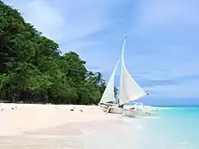 Un paraw naviguant devant l'île de Boracay. On distingue clairement le détail des espars et notamment les deux espars qui tiennent la voile : Une bôme et dont antenne verticale doublant le mât.