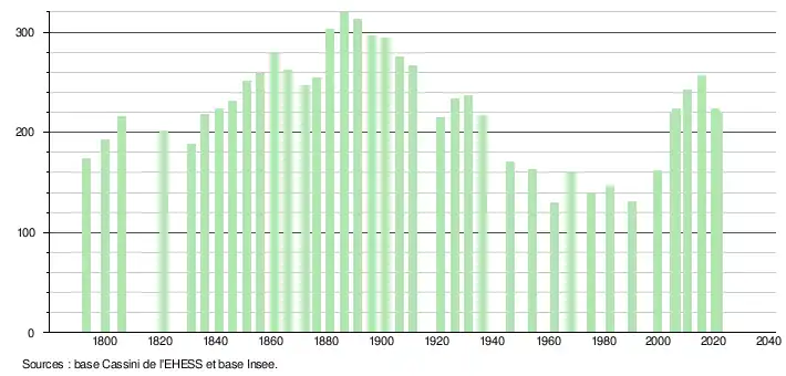 L'évolution du nombre d'habitants est connue à travers les recensements de la population effectués dans la commune depuis 1793. Pour les communes de moins de 10 000 habitants, une enquête de recensement portant sur toute la population est réalisée tous les cinq ans, les populations légales des années intermédiaires étant quant à elles estimées par interpolation ou extrapolation[17]. Pour la commune, le premier recensement exhaustif entrant dans le cadre du nouveau dispositif a été réalisé en 2005[18].