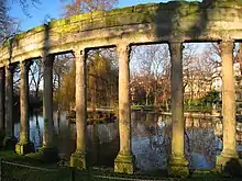 À quelques pas se trouve la Naumachie (inspiré des naumachies de l'Antiquité romaine, spectacles de batailles navales), bassin ovale bordé d'une colonnade corinthienne qui provient de la Rotonde des Valois, le monument funéraire imaginé par Catherine de Médicis en 1559 pour son époux en ajout à la basilique Saint-Denis et détruit en 1719 ; les colonnes furent récupérées et installées par Carmontelle pour décorer le bassin[1]. À proximité se dresse une grande arcade style Renaissance, relique de l'hôtel de ville de Paris incendié en 1871 (on compte également des fragments de colonnes)[2].