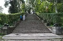 - Le Grand Escalier de pierre (1799, architecte V. Brenna) descend du palais vers les pentes vallonnées de la Slavianka. Il comprend soixante-quatre marches avec des statues de lions et des vases dans la partie haute et une paire de lions de fonte dans la partie basse.