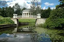 - Deux ponts, le pont Bossu et le pont Noir conduisent à une petite île. Le premier est construit en tuffeau par Cameron en 1784 sous forme de ruines et le second est construit par Cameron dans les années 1780 et reconstruit par Brenna en métal.