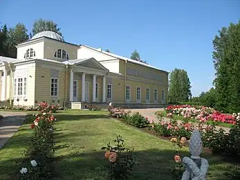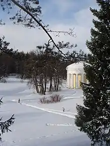 - Plus loin, le Pavillon de Rossi, construit à l'emplacement de l'ancien théâtre, date de 1913, selon les plans de l'architecte pétersbourgeois Carl Schmidt d'après un projet inabouti de Carlo Rossi de 1816. Le pavillon se présente en demi-cercle comme une charmante gloriette avec des colonnes et une coupole hémisphérique. Au milieu un monument en mémoire de l'impératrice est placé en 1914 par le sculpteur Vladimir Beklemichev[1].