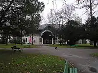 - L'entrée principale, avec une banderole en arc de cercle où est écrit « Parc des expositions ». À l'avant se trouve un petit jardin public.