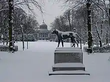 - Le dogue d'Ulm – bronze 1896 – Jean-Baptiste Van Heffen : lors du 75e anniversaire de l'Indépendance de la Belgique, une brillante exposition est organisée au Cinquantenaire et, à cette occasion, plusieurs sculptures sont exposées à l'entrée du parc de Woluwe, fraîchement inauguré. Face à une auberge, on pouvait voir un chien de bronze, rapidement patiné de vert. L'établissement s'appellera dès ce moment le « Chien vert », et fera placer sur son toit une enseigne en ferronnerie de deux mètres de haut en forme de chien assis de couleur verte. Cette pièce de métal, disparue en 1967, a retrouvé une place d'honneur au-dessus de la porte d'entrée de l'immeuble qui a remplacé l’auberge. Le chien de bronze a, quant à lui, été déplacé dans le parc du Cinquantenaire.