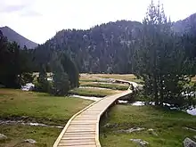 Le planell d'Aigüestortes (ca) est un ancien lac d'origine glaciaire colmaté par des sédiments. L'eau s'y écoule facilement entre pâturages et forêts et y a tracé de nombreux méandres. Après le pont de Moriano, une passerelle en bois de 400 m de long est suspendue au-dessus de ces multiples chenaux, permettant d'admirer l'environnement sans le dégrader. Ces eaux, où abondent les truites de rivière (Salmo trutta fario), alimentent un système d'exploitation hydroélectrique (par le groupe Endesa). Sur le plannell, pins à crochets et rhododendrons sont nombreux. Les rhododendrons abritent fréquemment un champignon parasite : Exobasidium rhododendri, qui engendre des malformations sur les feuilles des rhododendrons et couvre leurs revers des taches rougeâtres de ses sporanges vers la fin de l'été[3].