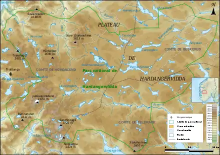 Le parc national de Hardangervidda est le plus grand des parcs nationaux de Norvège continentale avec 3 422 km2[F 1]. Le parc fait partie du territoire des communes de Eidfjord, Ullensvang et Odda dans le comté de Hordaland, Vinje et Tinn dans le comté de Telemark et Nore og Uvdal et Hol dans le comté de Buskerud[F 1]. Il est prolongé au nord par le paysage protégé de Skaupsjøen/Hardangerjøkulen (551 km2) et au sud-est par le paysage protégé de Møsvatn Austfjell (299 km2)[F 1].