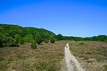 Dans la partie sud-est du parc s'étend une lande silicicole, à la végétation pauvre, ce qui est dû à l'aridité du sol principalement sableux, ainsi qu'au vent[N 20]. La végétation est buissonnante, avec des genévriers, de la bruyère callune (Calluna vulgaris), ainsi que de la laîche des sables (Carex arenaria)[N 20]. Parmi les rares fleurs que l'on peut trouver dans ces terrains, on peut citer l'anémone pulsatille (Pulsatilla vulgaris), l'immortelle des sables (Helichrysum arenarium) ou des formes naines de la caille-lait jaune (Galium verum) et de la piloselle (Hieracium pilosella)[N 20]. Ces terrains ouverts accueillent des espèces d'oiseaux différentes des forêts, telles que les coucous gris (Cuculus canorus), des laniidés, la bergeronnette grise (Motacilla alba) ou le rare pipit rousseline (Anthus campestris)[N 21]. En fin d'été, les criquets et sauterelles se font entendre à leur tour[N 21]. De même, parmi les animaux caractéristiques de ces terrains, on peut citer le lézard des souches (Lacerta agilis)[N 22]. Ce milieu accueille également un certain nombre de papillons, tels que l'agreste (Hipparchia semele), l'azuré de l'ajonc (Plebejus argus) ou encore la lithosie plombée (Eilema lurideola)[N 23].