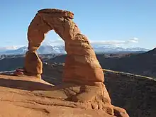 • Delicate Arch : C'est la plus photographiée des 2 000 arches du parc. Les habitants de la région l’ont d’abord surnommée « culotte d’institutrice », puis « culotte de vieille fille » et enfin « jambière de cowboy ». Devenue le symbole de l’Utah : on la retrouve dessinée sur les plaques d’immatriculation, les timbres. Le relais de la torche olympique des jeux de 2002 est passé dessous. Son nom lui a été attribué par Frank Beckwith au cours d’une de ses expéditions en 1933-1934. Son âge est estimé à 70 000 ans et son espérance de vie serait de 10 à 15 000 ans. C’est pourquoi, dans les années 1950, l’administration du parc avait pensé la protéger de l’érosion par un revêtement transparent plastique. Mais l’idée fut vite abandonnée ;