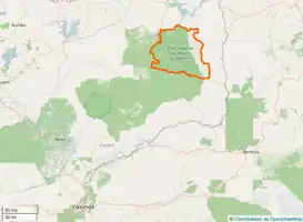 La parc national s'étend sur 416 512 ha ; il est limité au Nord par la rivière Migiri (21,5 km), la rivière Miyere (11,2 km), la rivière Mdjerem (16,4 km) et la rivière Malo (17,8 km) ; à l'Est par la rivière Merou (91,2 km) ; au Sud par la rivière Mdjerem (21,5 km), les rivières Mekie et Mehe (42,2 km), Mbi (40 km), Ngomsi (13,2 km) et la route Yoko-Sangbe ; à l'Ouest par la route Yoko-Sangbe (4 km), la rivière Sui (12,4 km), deux cours d'eau non dénommés de (11,4 km) et (9 km) respectivement, les rivières Meré (2,8 km) et Mfou (14,5 km), Beboun (15,8 km) ; la piste Sangbé vers Gongotoua (8,8 km)[1].