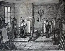 Afin de ne conserver que le derme, on doit enlever la chair, la graisse, et le poil de la peau. On commence par rincer les peaux à l’eau. Une source d’eau courante constitue une économie de labeur importante puisqu'au lieu d’agiter les peaux à la main, on peut simplement les accrocher dans une rivière et laisser le courant effectuer le travail[2]. Le rinçage à l'eau libère les peaux des impuretés les plus facilement détachables. Le nettoyage est complété manuellement à l’aide d’une poutre et d’un couteau courbé qui se tient à deux mains. Les peaux sont étendues sur la poutre et on y passe alternativement le côté convexe, non-tranchant, pour presser l’eau hors de la peau, et le côté concave, tranchant, pour enlever les inégalités et ce qui reste de chair [2].