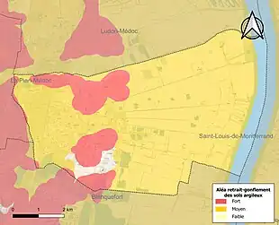 Le retrait-gonflement des sols argileux est susceptible d'engendrer des dommages importants aux bâtiments en cas d’alternance de périodes de sécheresse et de pluie. 92,5 % de la superficie communale est en aléa moyen ou fort (67,4 % au niveau départemental et 48,5 % au niveau national). Sur les 2 946 bâtiments dénombrés sur la commune en 2019, 2 789 sont en aléa moyen ou fort, soit 95 %, à comparer aux 84 % au niveau départemental et 54 % au niveau national. Une cartographie de l'exposition du territoire national au retrait gonflement des sols argileux est disponible sur le site du BRGM[25],[Carte 2].