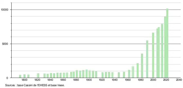 L'évolution du nombre d'habitants est connue à travers les recensements de la population effectués dans la commune depuis 1793. Pour les communes de moins de 10 000 habitants, une enquête de recensement portant sur toute la population est réalisée tous les cinq ans, les populations légales des années intermédiaires étant quant à elles estimées par interpolation ou extrapolation[36]. Pour la commune, le premier recensement exhaustif entrant dans le cadre du nouveau dispositif a été réalisé en 2008[37].