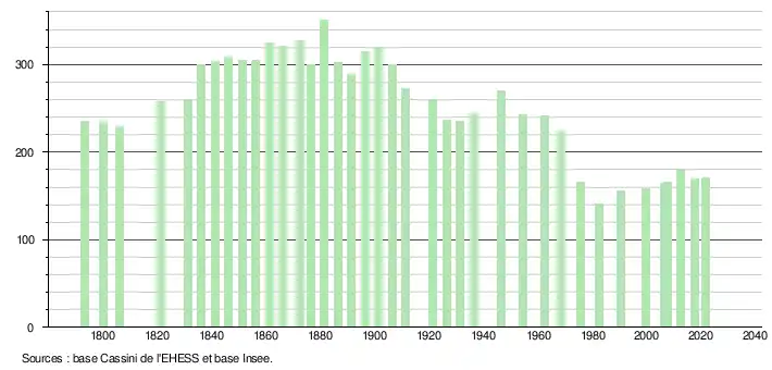 L'évolution du nombre d'habitants est connue à travers les recensements de la population effectués dans la commune depuis 1793. Pour les communes de moins de 10 000 habitants, une enquête de recensement portant sur toute la population est réalisée tous les cinq ans, les populations légales des années intermédiaires étant quant à elles estimées par interpolation ou extrapolation[23]. Pour la commune, le premier recensement exhaustif entrant dans le cadre du nouveau dispositif a été réalisé en 2007[24].
