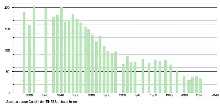 L'évolution du nombre d'habitants est connue à travers les recensements de la population effectués dans la commune depuis 1793. Pour les communes de moins de 10 000 habitants, une enquête de recensement portant sur toute la population est réalisée tous les cinq ans, les populations légales des années intermédiaires étant quant à elles estimées par interpolation ou extrapolation[32]. Pour la commune, le premier recensement exhaustif entrant dans le cadre du nouveau dispositif a été réalisé en 2005[33].
