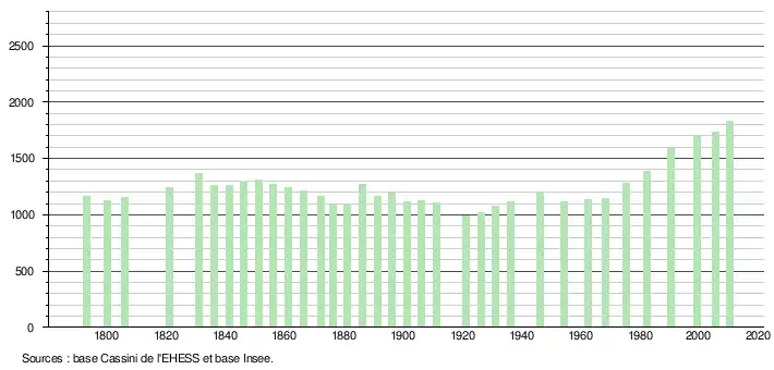 - Dans le tableau des recensements et le graphique, par convention dans Wikipédia, le principe a été retenu, pour les populations légales postérieures à 1999 de n’afficher dans le tableau des recensements et le graphique que les populations correspondant à l'année 2006, première population légale publiée calculée conformément aux concepts définis dans le décret no 2003-485 du 5 juin 2003, et les années correspondant à une enquête exhaustive de recensement pour les communes de moins de 10 000 habitants, ainsi que la dernière population légale publiée par l’Insee.