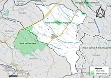 L'occupation des sols de la commune, telle qu'elle ressort de la base de données européenne d’occupation biophysique des sols Corine Land Cover (CLC), est marquée par l'importance des territoires agricoles (87,6 % en 2018), une proportion sensiblement équivalente à celle de 1990 (88,5 %). La répartition détaillée en 2018 est la suivante : terres arables (54,9 %), zones agricoles hétérogènes (23,7 %), forêts (11,5 %), prairies (7,4 %), cultures permanentes (1,6 %), zones urbanisées (1 %)[20]. L'évolution de l’occupation des sols de la commune et de ses infrastructures peut être observée sur les différentes représentations cartographiques du territoire : la carte de Cassini (XVIIIe siècle), la carte d'état-major (1820-1866) et les cartes ou photos aériennes de l'IGN pour la période actuelle (1950 à aujourd'hui)[Carte 2].