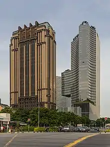 Parkview Square et hôtel Andaz à Singapour, vus depuis la rue Rochord à 17h. Bien qu'il s'agisse d'un bâtiment moderne, achevé en 2002, Parkview Square a bénéficié d'un design dans le style Art déco et est l'un des bâtiments de bureaux les plus chers de Singapour. Juin 2018.