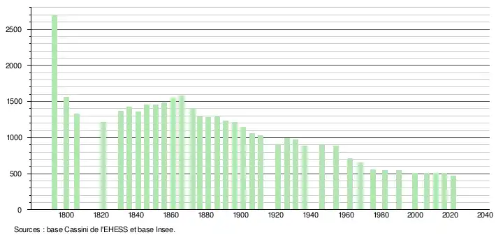 | L'évolution du nombre d'habitants est connue à travers les recensements de la population effectués dans la commune depuis 1793. Pour les communes de moins de 10 000 habitants, une enquête de recensement portant sur toute la population est réalisée tous les cinq ans, les populations légales des années intermédiaires étant quant à elles estimées par interpolation ou extrapolation[22]. Pour la commune, le premier recensement exhaustif entrant dans le cadre du nouveau dispositif a été réalisé en 2006[23]. En 2021, la commune comptait 471 habitants[Note 6], en diminution de 7,47 % par rapport à 2015 (Landes : +4,9 %, France hors Mayotte : +1,84 %). |